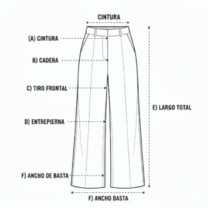 | Talla | Cintura (A) | Cadera (B) | Tiro Frontal (C) | Entrepierna (D) | Ancho Basta (F) | Largo Total (E) |